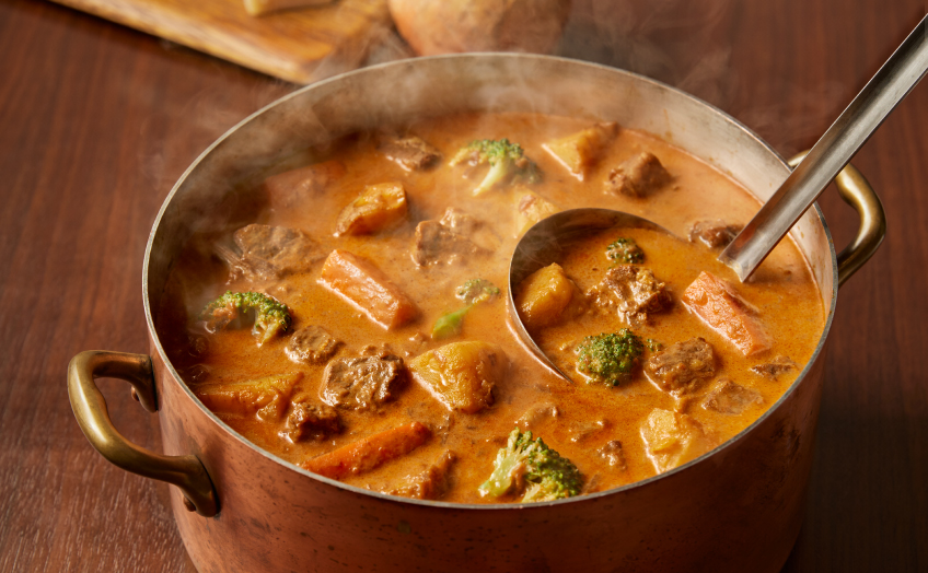 Soup Stock Tokyo では、牛肉の旨味にミルクと生クリーム、チーズが溶け込んだ冬一番の人気スープ1『温野菜とチーズのブラウンシチュー』と2『オマール海老ソースと帆立のケイジャン風フリカッセ』の販売をスタート!ブラウンシチューの「ブラ ウン」は、じっくり炒めた玉葱の色。柔ら かな牛肉の濃厚な旨味にミルクとチーズが 溶け合うこのシチューは、スープ専門店な らではのこだわりがつまった一品。ブロッ コリー、じゃがいも、にんじんなど、温野菜がごろっと入っていて食べ応えも十分で、冬一番人気のシチューです。「フリカッセ」 は食材をクリームで煮込んだフランスの家 庭料理。そのフリカッセを、Soup Stock Tokyo ならではのオマール海老ソースと、 アメリカ南部のケイジャン料理特有のスパ イスでアレンジした一皿です。オマール海 老の旨味の中にごろごろとした帆立の存在 感と、ケイジャン料理の特徴であるスパイ スの中に、ホットソースの辛酸っぱいアク セント。お皿に添えた軽やかな酸味のサワー ソースを加えていただくことで、爽やかな 味わいに味を変えながら食べすすめていた だくことができます。12月26日(金) まで、 Soup Stock Tokyo 外食店舗(一部店舗を除く)で販売。
